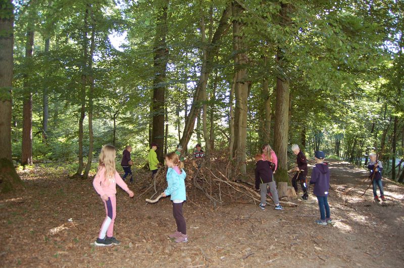 Gut ausgerüstet mit Rucksack, festem Schuhwerk und bester Laune ging es früh am Morgen in den Dahlheimer Wald. Nachdem alle den anstrengenden Anstieg zum Wald bewältigt hatten, führte der Weg die Kinder zum alten Sportplatz. Hier wurden zunächst die Rucksäcke ausgepackt und es konnte ausgiebig gefrühstückt werden. Schnell zog es die Kinder aber wieder in den Wald. Dort wurden Hütten gebaut, „Waldschätze“ gesammelt und gemeinsam gespielt.